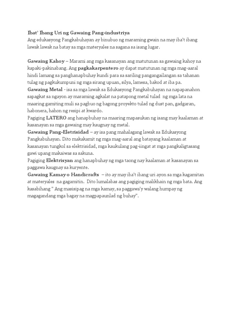 Ibat Ibang Uri ng Gawaing Pang-industriya Ang edukasyong Pangkabuhayan ay binubuo ng maraming gwain na may ibat ibang lawak lawak na batay sa mga materyales na sagana sa isang lugar. Sa pamamagitan ng computer at Internet magagawa mong tuklasin ang mga bagong paraan sa pagkuha ng kaalaman at kapaki-pakinabang na impormasyon sa halos anumang larangan ng pag-aaral isang bagay na mailalarawan sa isip at lampas kung ano ang. Ang mga maari mo magawa sa gawaing kahoy ay upoan lamesa kabinet pinto at madami pang iba.