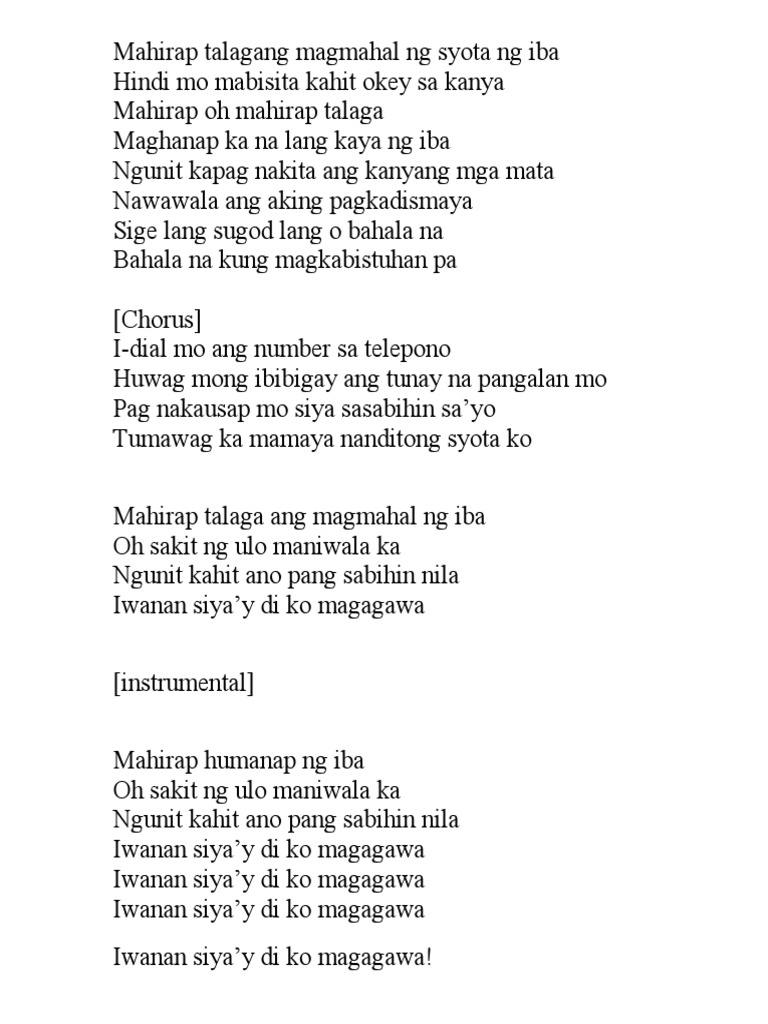 MahFirapFdim Oh mahG7irap talaga MagGm7hanap na lang kaya ngC76 iba. Nawawala ang aking pagkadismaya. Mahirap talagang magmahal ng syota ng iba Hindi mo mabisita kahit okey sa kanya Mahirap oh mahirap talaga Maghanap ka na lang kaya ng iba Ngunit kapag nakita ang kanyang mga mata Nawawala ang aking pagkadismaya Sige lang sugod lang o bahala na Bahala na kung magkabistuhan pa Chorus I-dial mo ang number sa telepono Huwag mong bigay ang tunay.