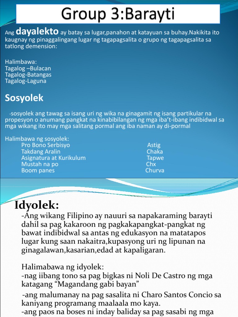 Salamat po sa gumawa nito. Mahalagang matutuhan ang konsepto ng idyolek dahil sinasabing ang lahat ng ibang barayiti ng wika. Share to Twitter Share to Facebook Share to Pinterest.